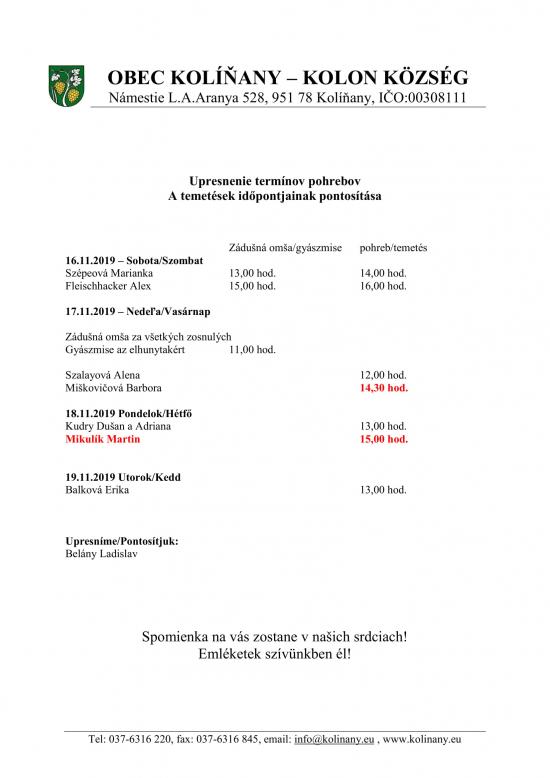 Harmonogram pohrebov v obci Kolíňany - upresnenie 1