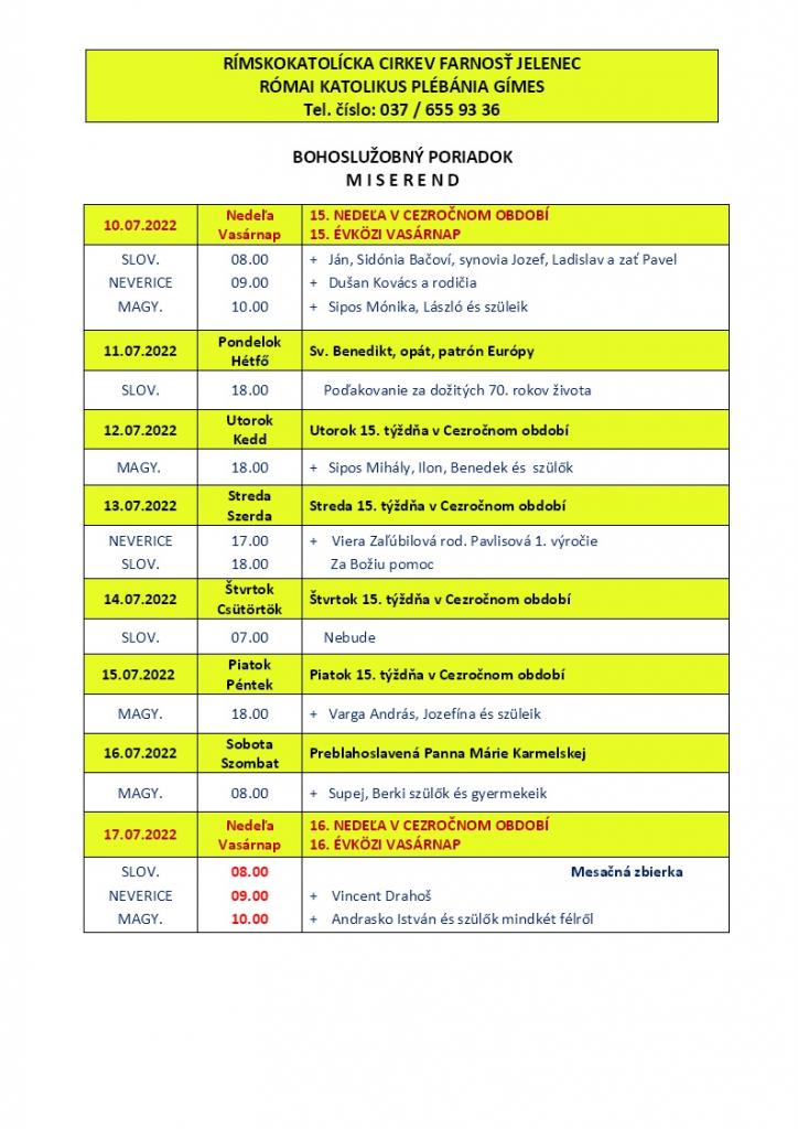 Omšový poriadok - Miserend - 11.7.2022 - 17.7.2022 1