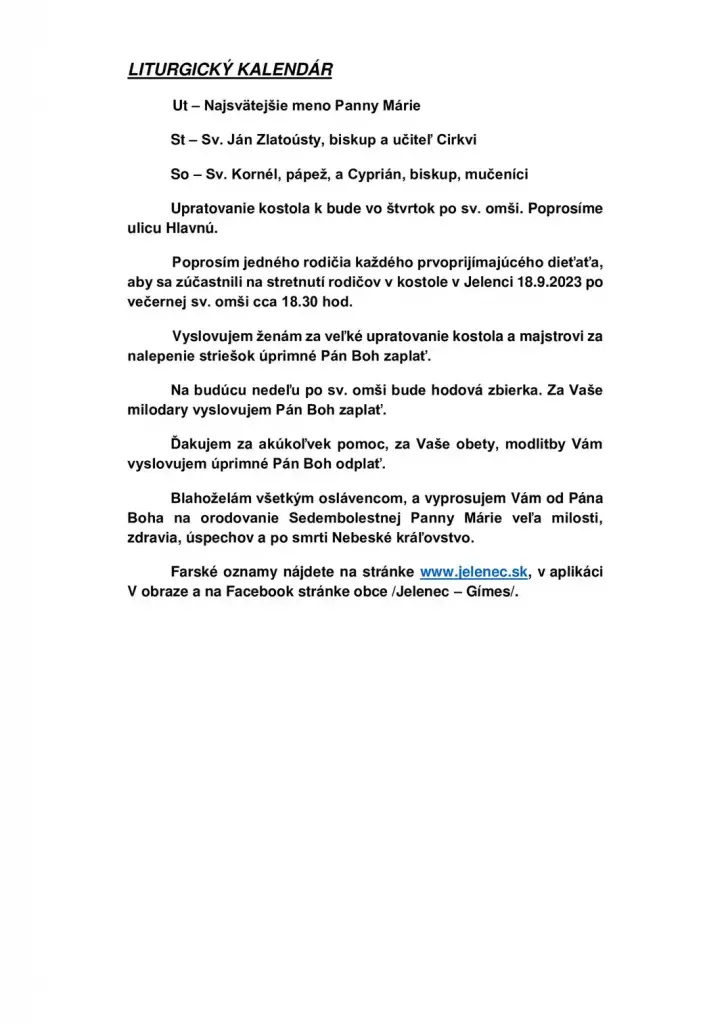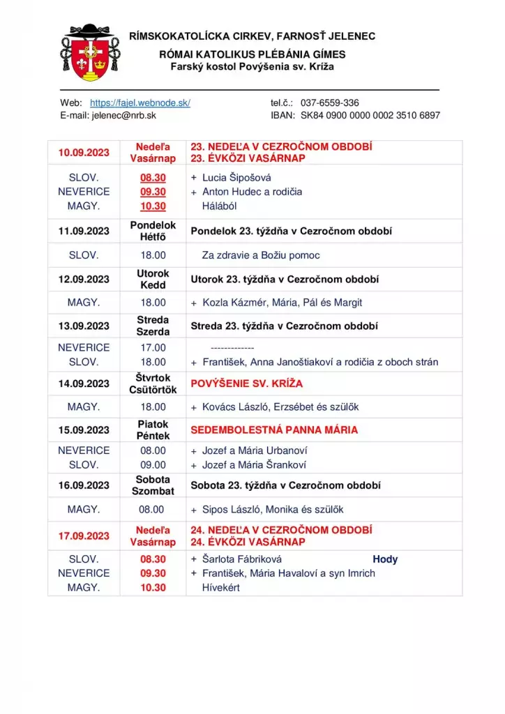 Omšový poriadok - Miserend - 11.9.2023 - 17.9.2023 1