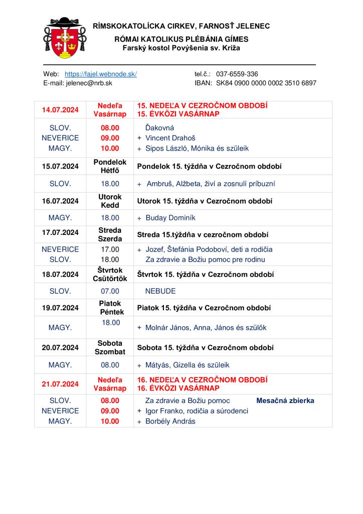 Omšový poriadok - Miserend - 15.7.2024 - 21.7.2024 1
