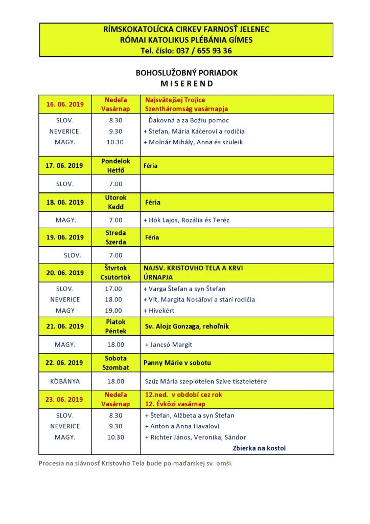 Omšový poriadok - Miserend 17.6.2019 - 23.6.2019