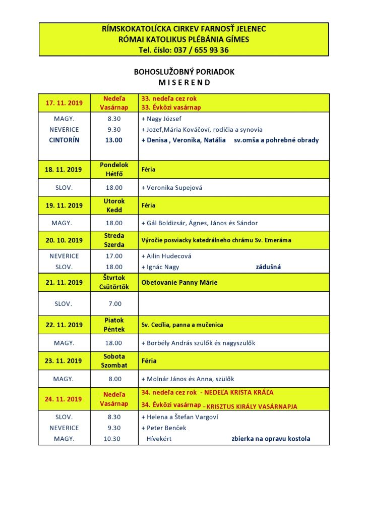 Omšový poriadok - Miserend 18.11.2019 - 24.11.2019