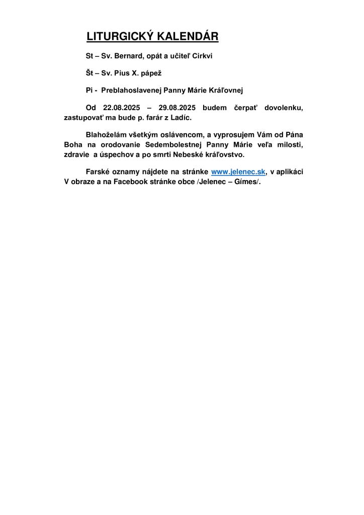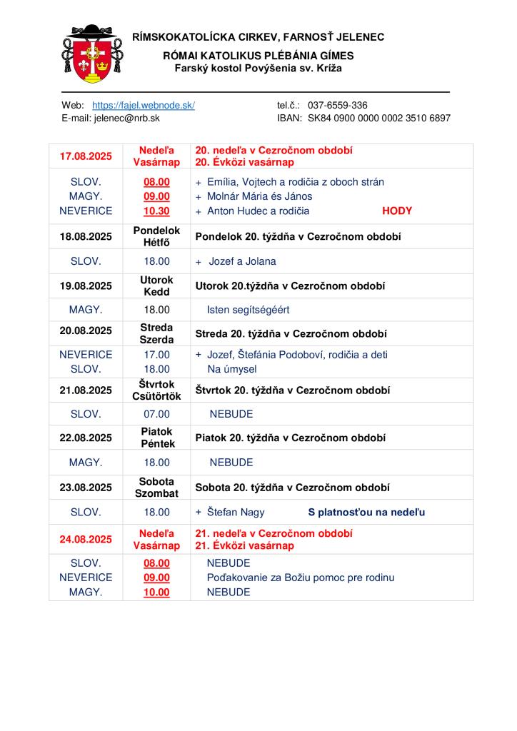 Omšový poriadok - Miserend - 18.8.2025 - 24.8.2025 1