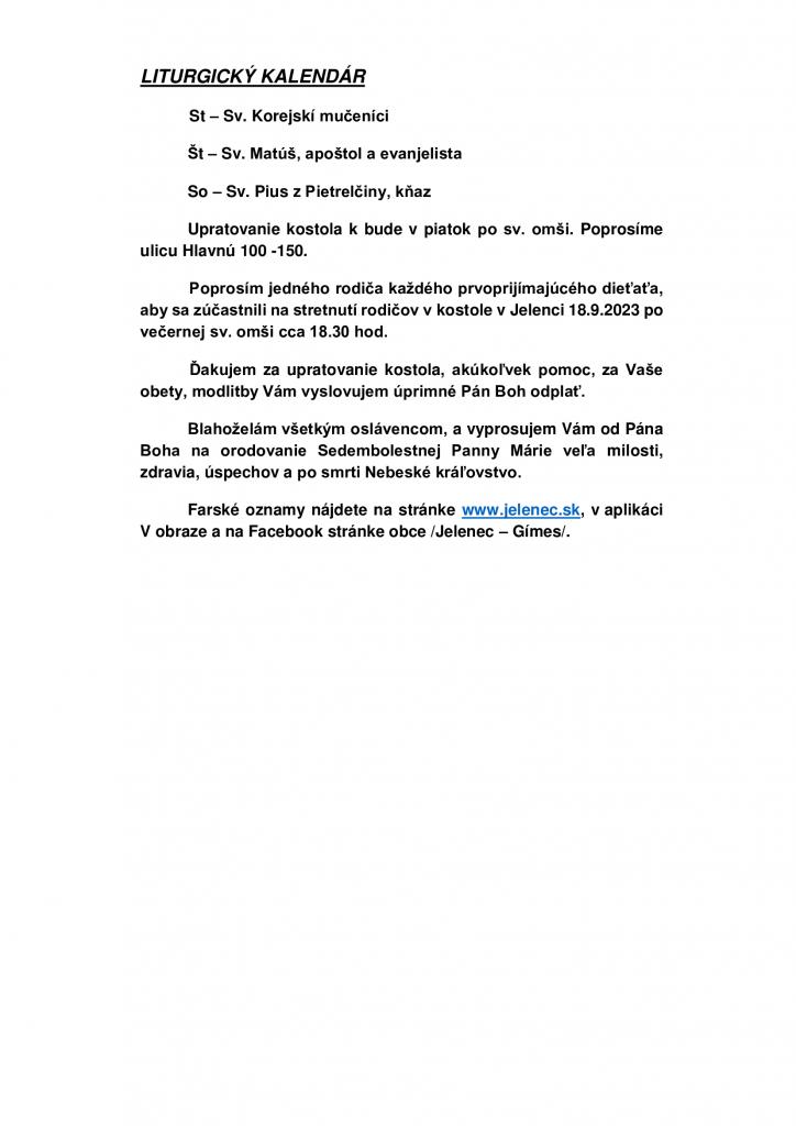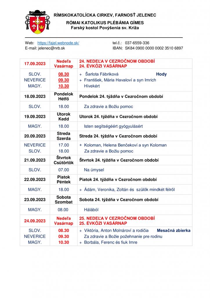 Omšový poriadok - Miserend - 18.9.2023 - 24.9.2023 1