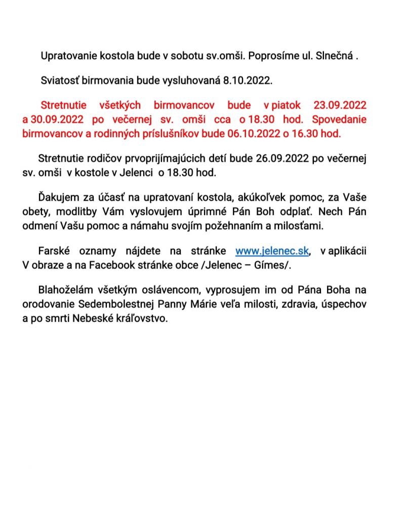 Omšový poriadok - Miserend - 19.9.2022 - 25.9.2022