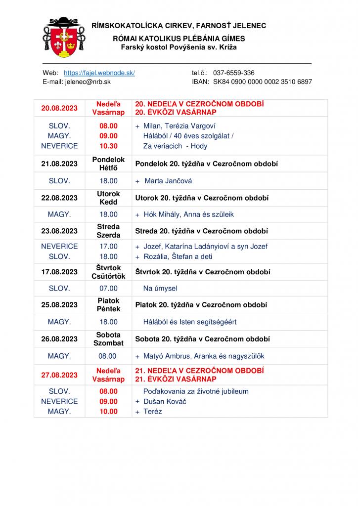 Omšový poriadok - Miserend - 21.8.2023 - 27.8.2023 1