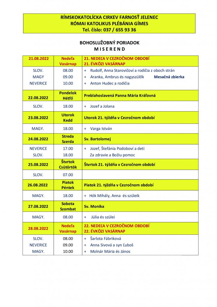 Omšový poriadok - Miserend - 22.8.2022 - 28.8.2022 1