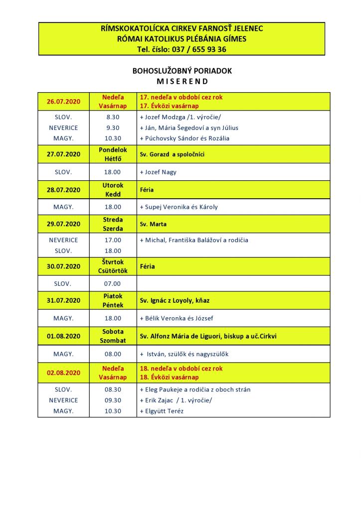 Omšový poriadok - Miserend - 27.7.2020 - 2.8.2020 1