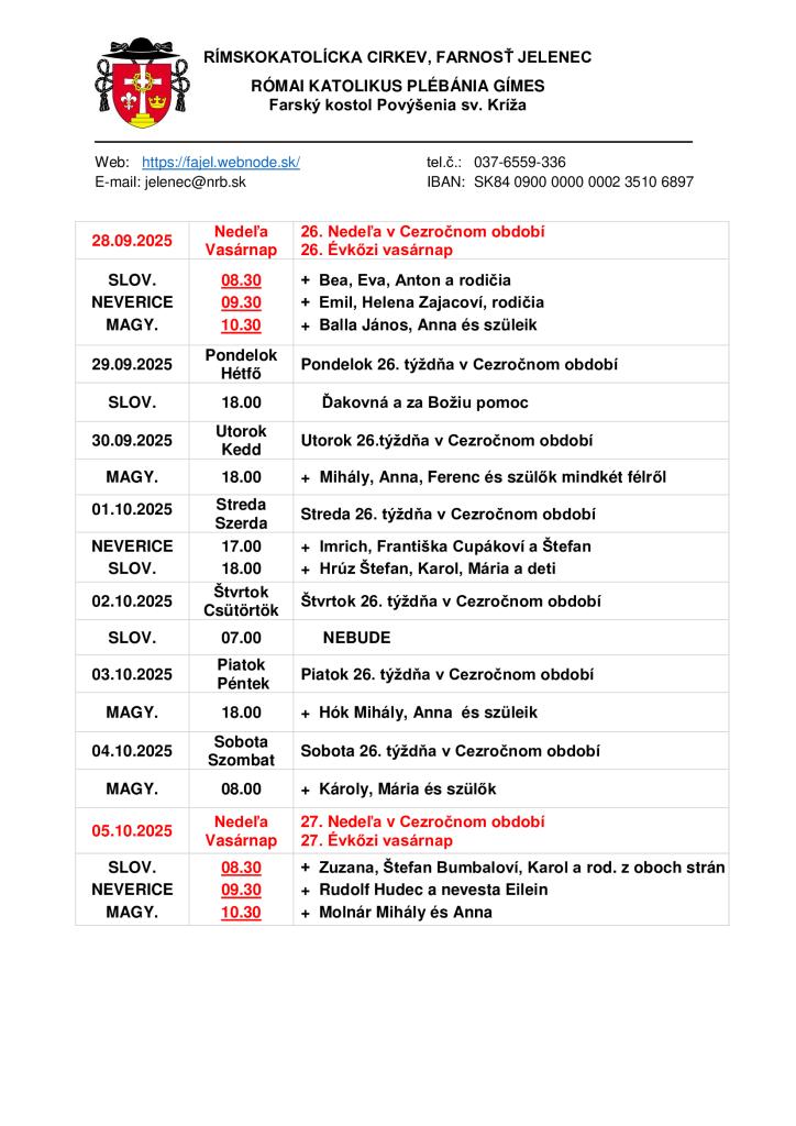 Omšový poriadok - Miserend - 29.9.2025 - 5.10.2025