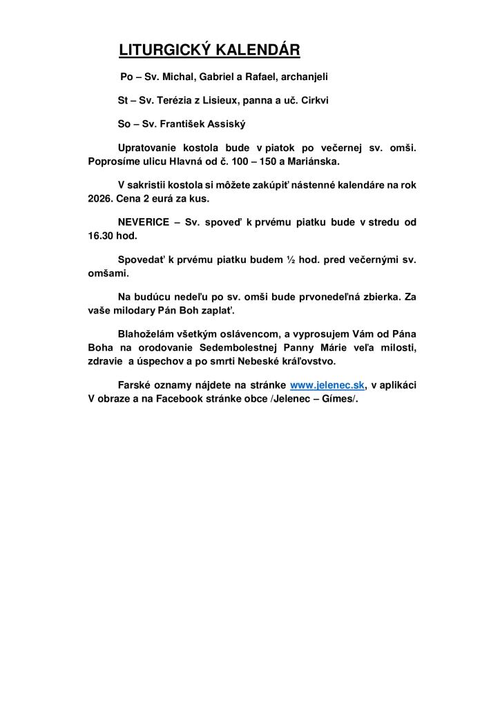 Rozpis svätých omší a informácie nájdete v prílohe.