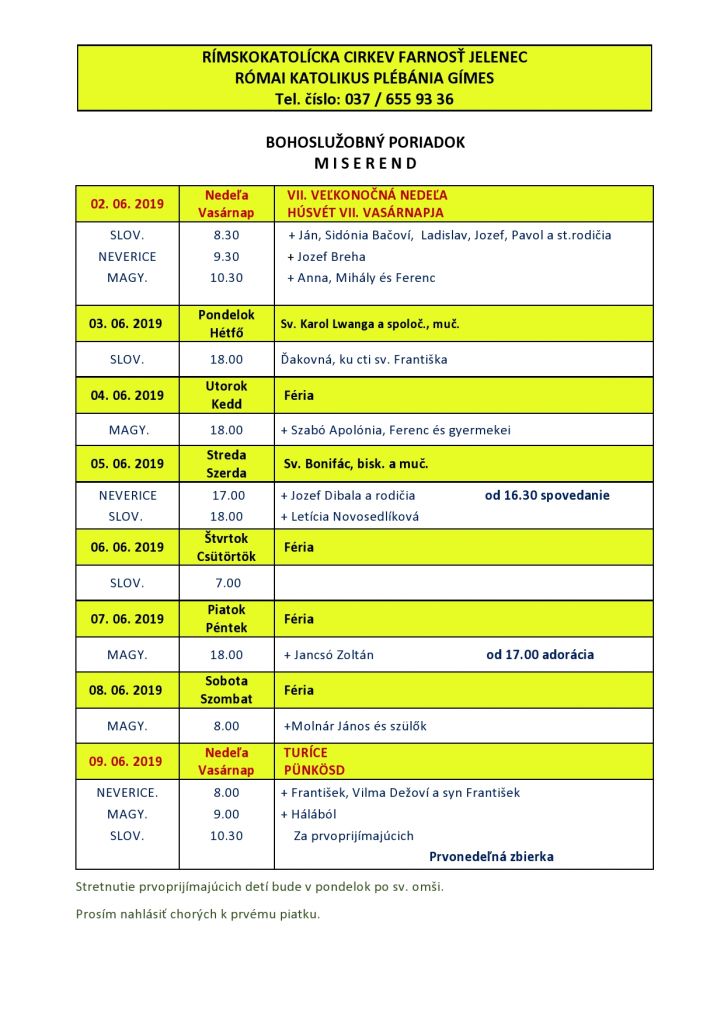 Omšový poriadok - Miserend - 3.6.2019 - 9.6.2019