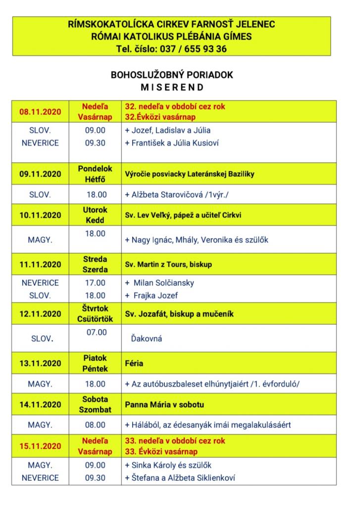 Omšový poriadok - Miserend - 9.11.2020 - 15.11.2020 1