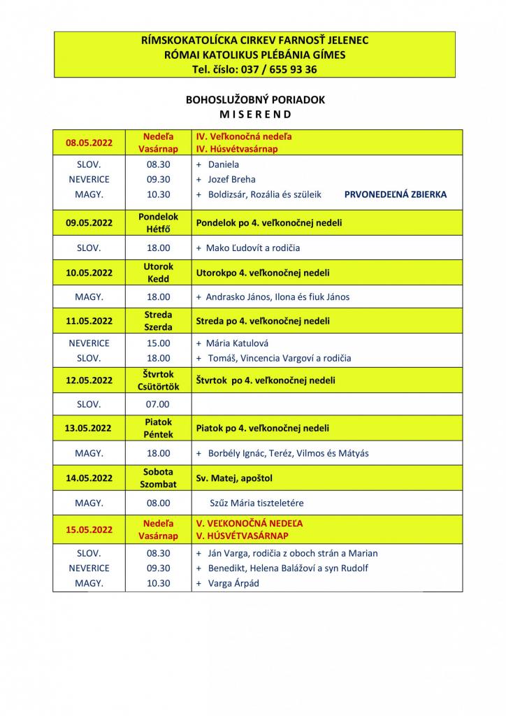 Omšový poriadok - Miserend - 9.5.2022 - 15.5.2022 1