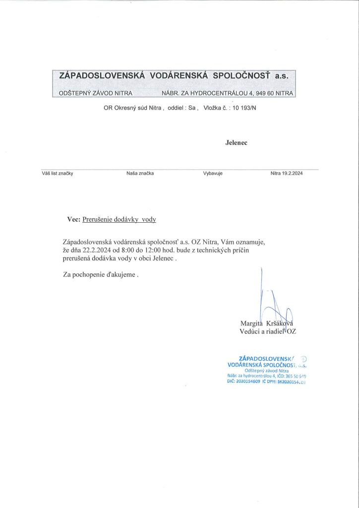 Západoslovenská vodárenská spoločnosť, a.s. OZ Nitra oznamuje, že dňa 22.2.2024, od 08:00 do 12:00 hod. bude z technických príčin prerušená dodávky vody v obci Jelenec.