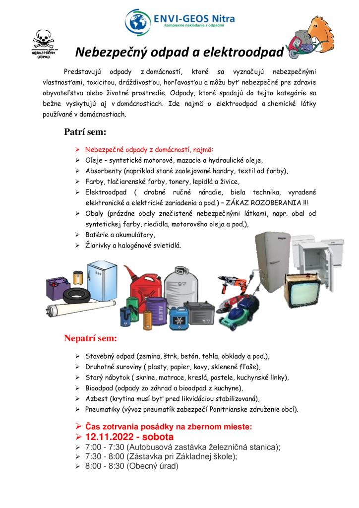 Dňa 12.11.2022, t.j. v sobotu sa uskutoční zber nebezpečného odpadu a elektro odpadu. Viac informácií nájdete v prílohe.