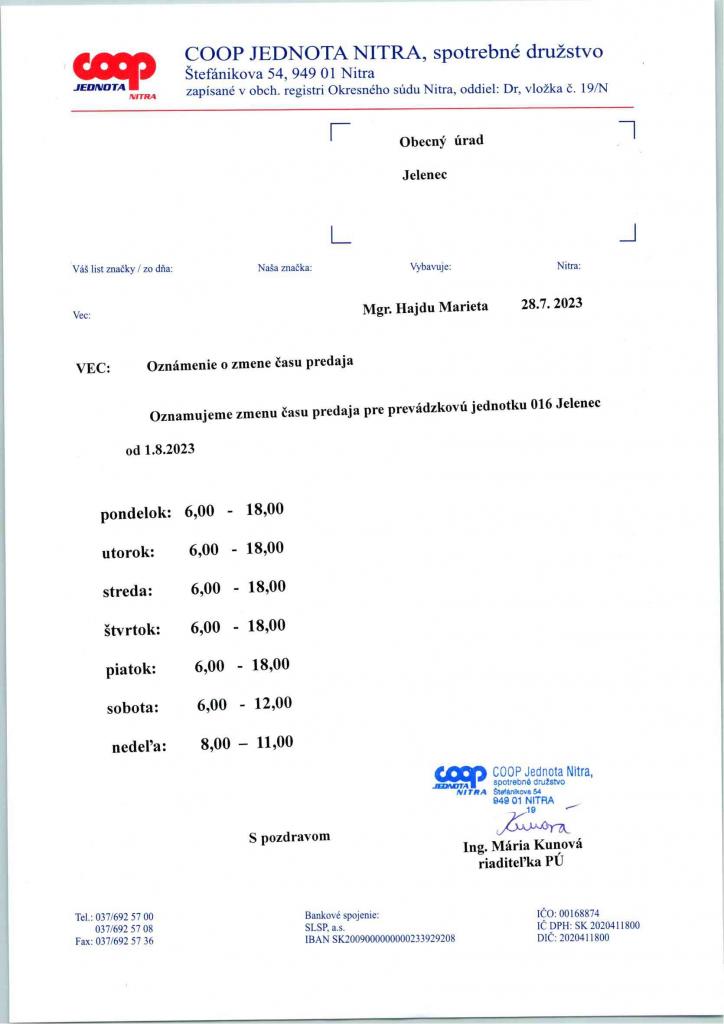 Informáciu o nových otváracích hodinách nájdete v prílohe.