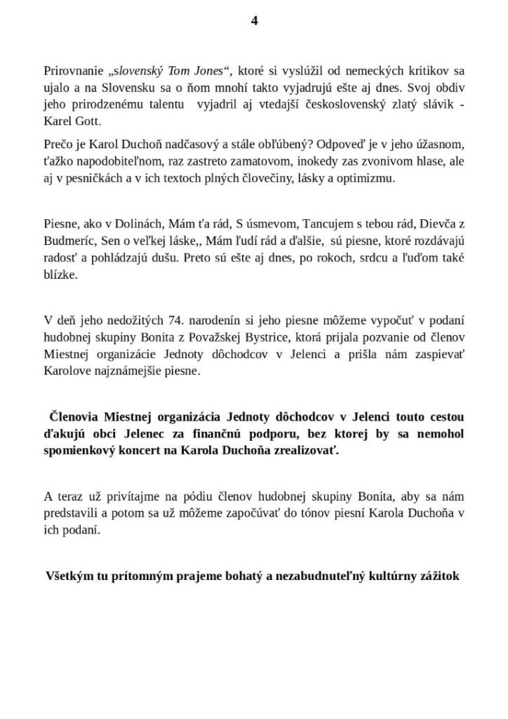 ZO Jednoty dôchodcov v Jelenci v spolupráci s obcou usporiadala 21. apríla 2024 spomienkový koncert na počesť speváckej legende Karolovi Duchoňovi. O slávnostnú atmosféru podujatia sa postarala hudobná skupina Bonita z Považskej Bystrice, ktorá piesňami nášho Karola prítomnému obecenstvu spríjemnila nedeľné popoludnie.